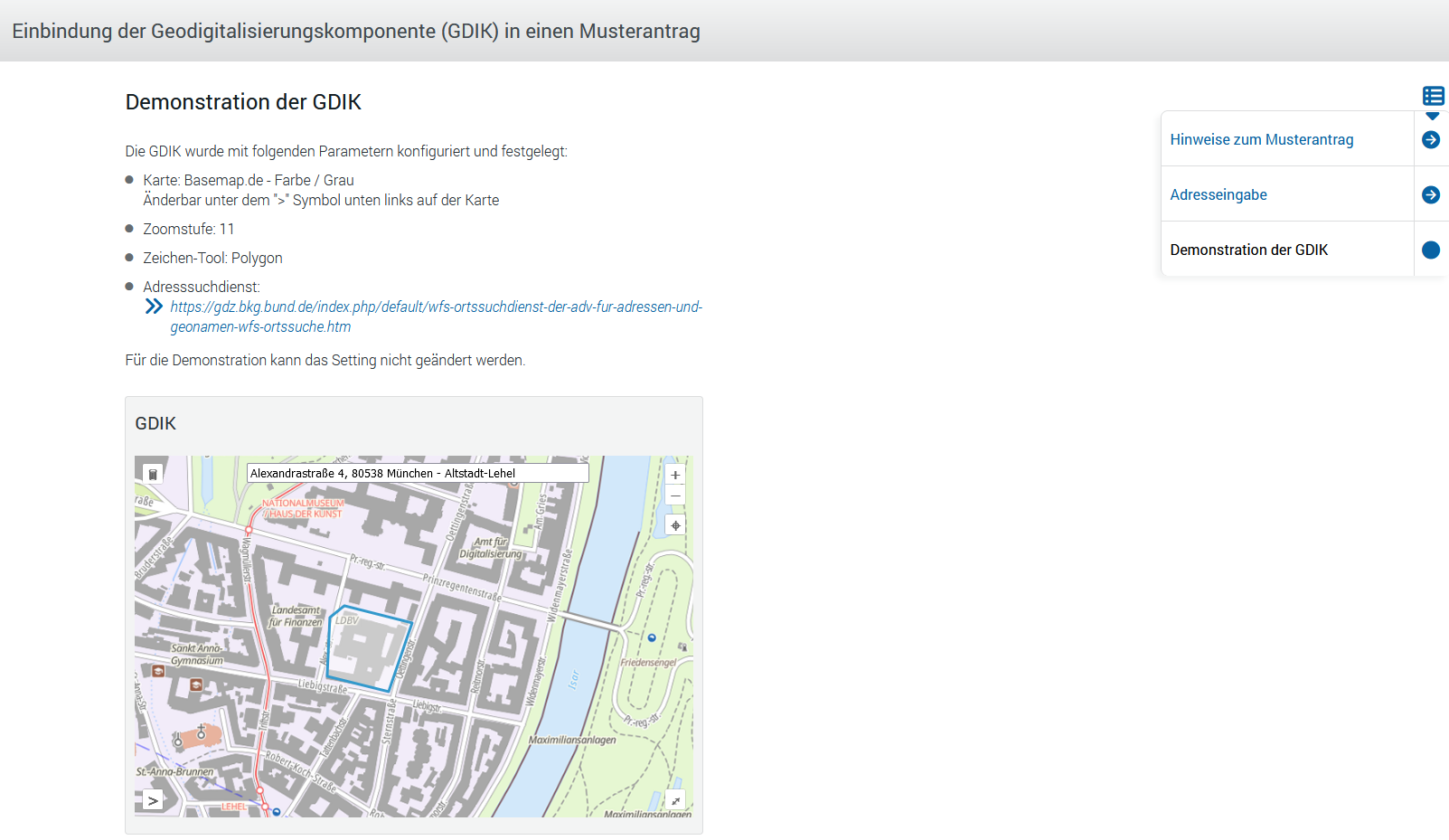 Mit diesem Musterantrag wird die Einbindung der Geodigitalisierungskomponente (GDIK) in einen Antrag sowie die Datenübermittlung demonstriert.