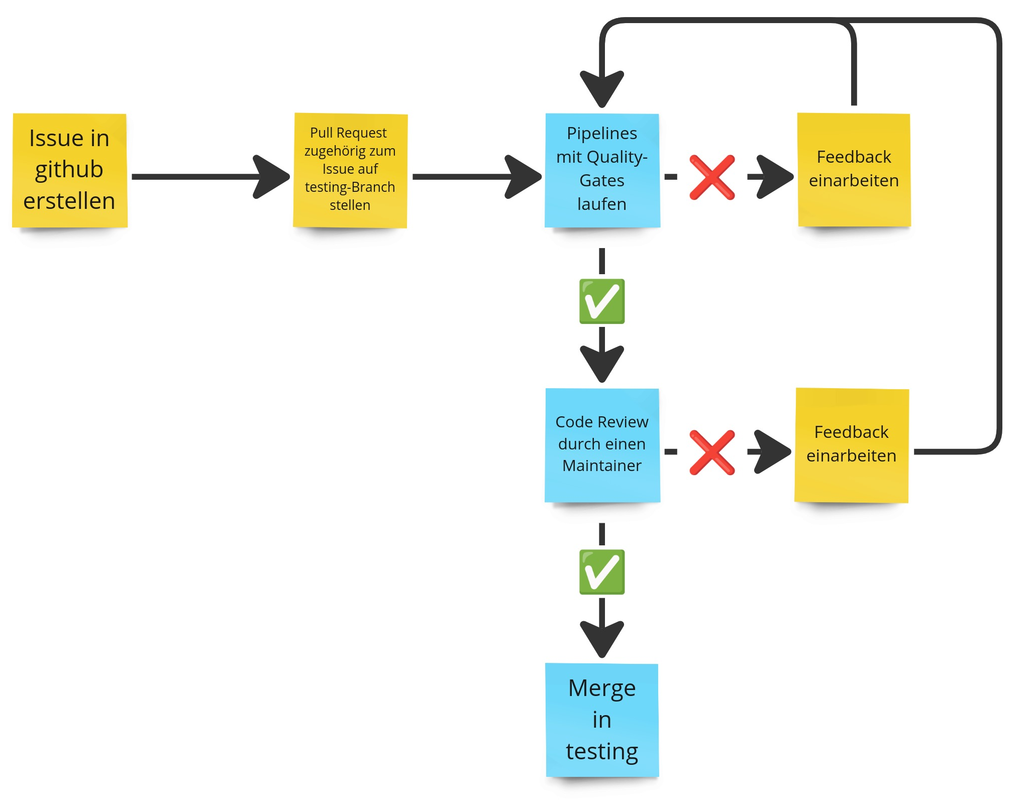 Während der Entwicklung ist durch automatisch startende Pipelines kontinuierliches Feedback durch Linting, Audit und Testing sichergestellt. Zur Übernahme eines Branches in einen der Protected Branches ist ein erfolgreiches Durchlaufen der Pipelines nötig.