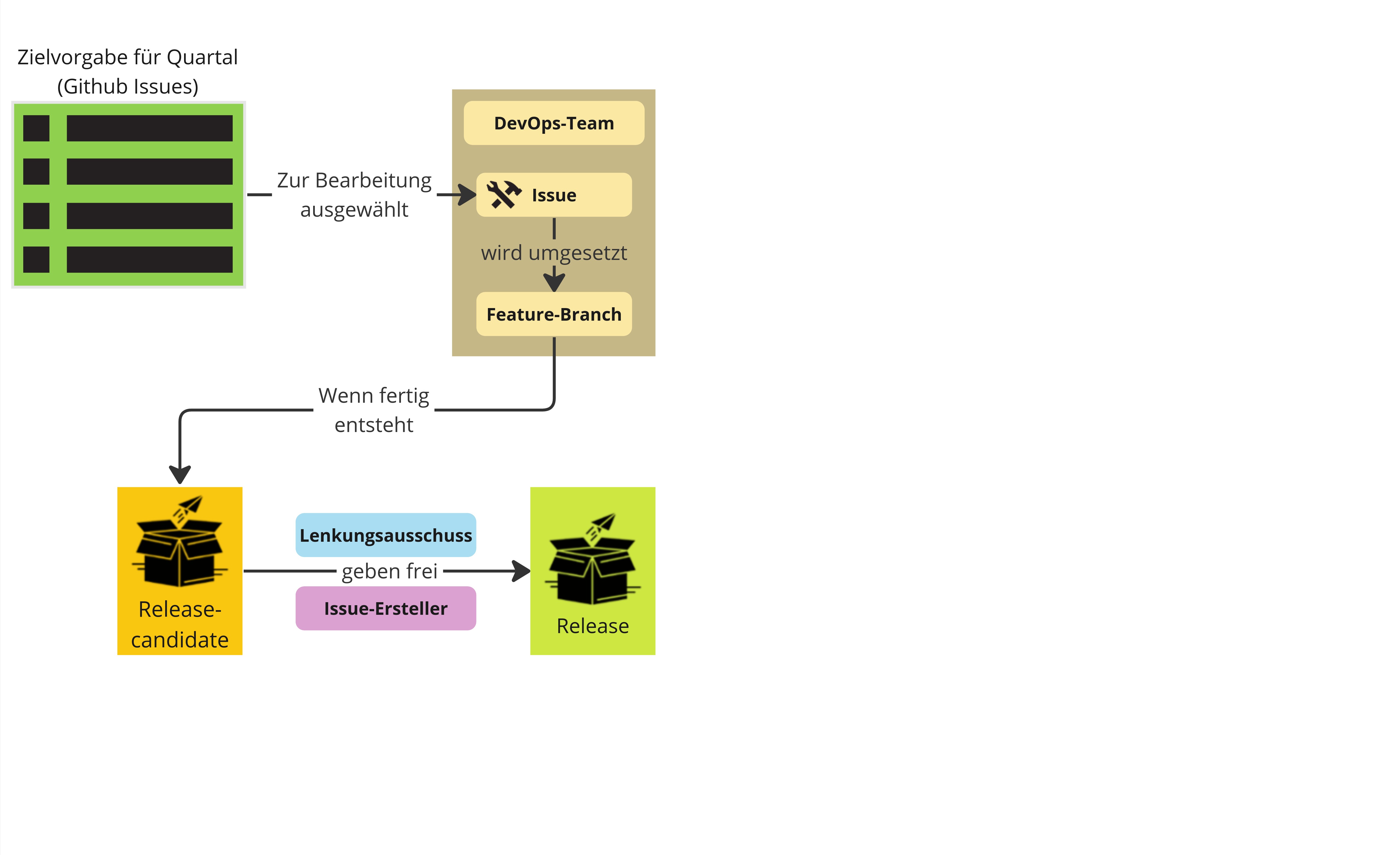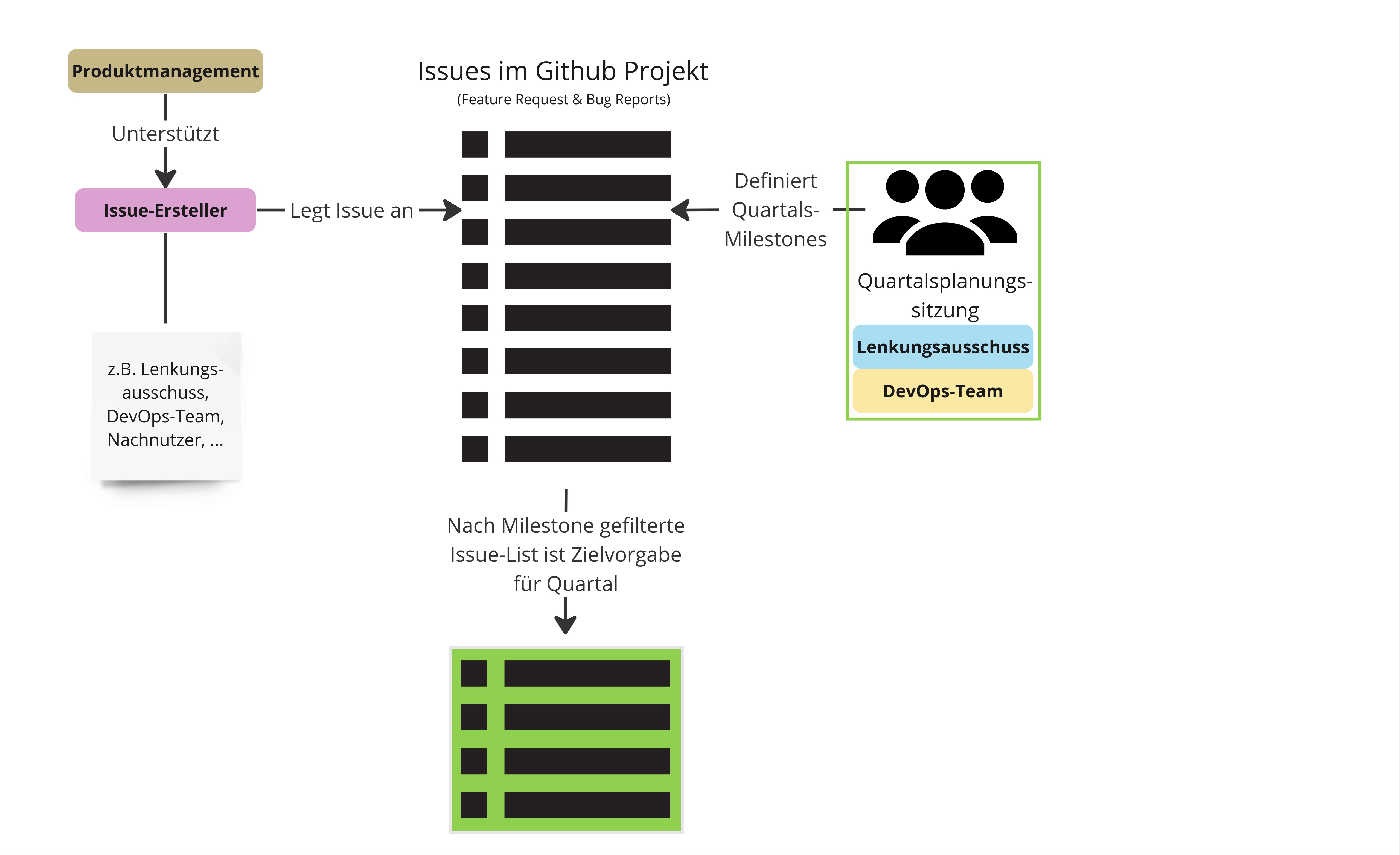 Die Issues werden über Milestones nach dem Schema Quartal/Jahr (z.B. Q3J2024) geordnet. So wird festgelegt, welche Issues in einem Quartal bearbeitet werden. Zusätzlich zu den Milestones werden Issues mit “Must”, “Should” und “Could” getaggt und so eine Priorisierung der Issues innerhalb einer Milestones hergestellt.